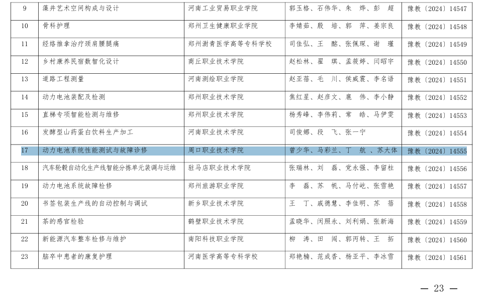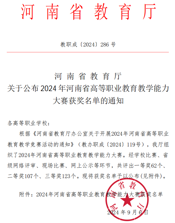 近日,河南省教育厅下发《关于公布2024年河南省高等职业公司产品能力大赛获奖名单的通知》(教职成〔2024〕286号),公司教师曾少华、马彩兰、丁航、苏大体团队的《动力电池系统性能测试与故障诊修》获得三等奖
