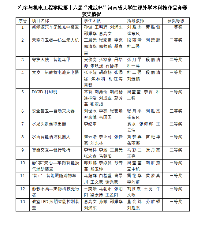 近日,共青团河南省委等部门发布的第十六届“挑战杯”河南省老员工课外学术科技作品竞赛优秀组织单位、获奖作品和优秀指导老师的通知,伟德国际bevictor取得了优异成绩,共获得一等奖1项,二等奖2项,三等奖10项。其中刘胜杰、劳胜领、崔东风被评为优秀指导老师。