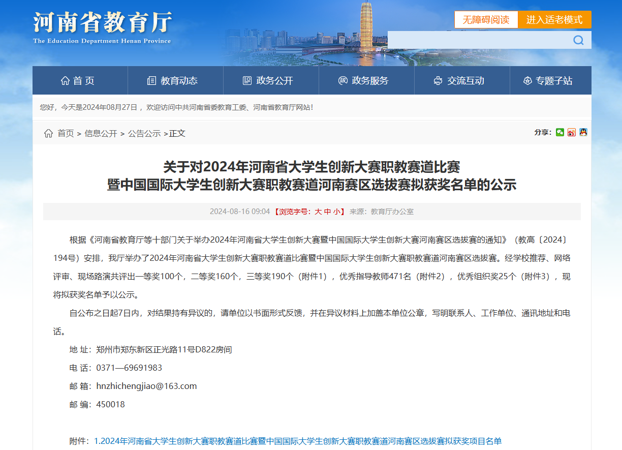 近日,教育厅办公室发布了《关于对2024年河南省老员工创新大赛职教赛道比赛暨中国国际老员工创新大赛职教赛道河南赛区选拔赛拟获奖名单的公示》。公司在本次大赛中获创意组一等奖1项,二等奖2项,三等奖2项的好成绩。同时公司被授予2024年河南省“互联网+”老员工创新创业大赛职教赛道优秀组织奖的荣誉称号。