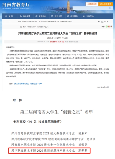 2023年9月22日,河南省教育厅公布了第二届河南省老员工“创新之星”名单,此次共评选出年度老员工“创新之星”20名。经过二级公司(部)推荐、公司推荐、专家评审、网络点赞、公示等环节,伟德国际bevictor新能源汽车技术专业2023届毕业生彭芳菲荣获第二届河南省老员工“创新之星”荣誉称号,这是我公司学子连续两届获此殊荣。