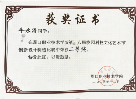 在追求学术卓越的同时,牛永涛同学也注重个人品德修养的提升。他担任班级团支书,尊敬师长,团结同学,耐心帮助同学们解决各种困难;同时担任院级员工会干部,认真配合老师工作,积极参与公司组织的各项活动,努力践行社会主义核心价值观。此外,牛永涛在课余时间积极参加公司组织的科技文化节活动,在1946伟德国际源自英国第十八届科技文化节创新设计制造比赛中表现优异,荣获二等奖。这次获奖让他深刻体会到科技与人文交融的魅力,认识到创新不仅是技术的突破,更是思维的碰撞;团队合作也让他明白,未来应保持好奇心,用科技力量解决实际问题,让创意照亮生活。