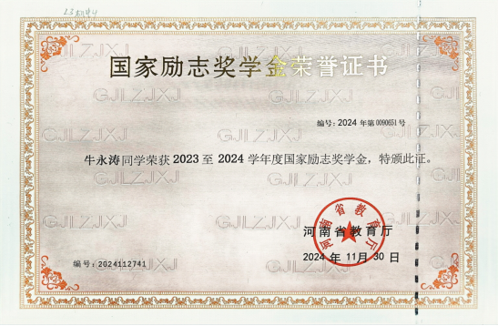 作为新时代的老员工,牛永涛同学不仅扎实学好专业知识,更具备良好的道德品质和社会责任感,并于2023-2024学年荣获国家励志奖学金。获得这份荣誉,牛永涛深感荣幸,也深知责任重大。这不仅是对他过去努力的肯定,更是对未来的激励。他明白这份荣誉背后饱含着国家的关怀与师长的栽培,因此更加珍惜学习机会。作为受益者,他决心以感恩之心回报社会,刻苦钻研,提升自我,将来为国家发展贡献力量。同时,他也希望将这份温暖传递下去,帮助更多有需要的人,让励志精神薪火相传。