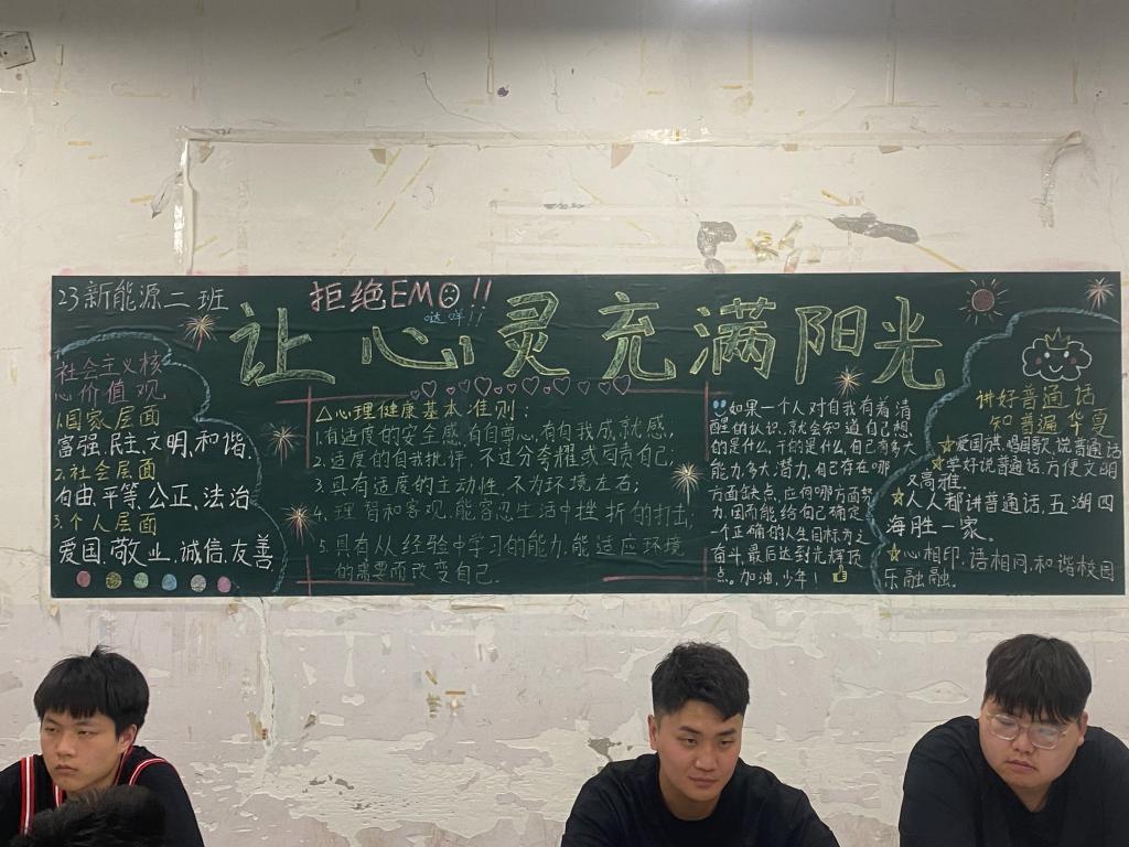 在各班班委的精心组织下,同学们积极参与,围绕心理健康主题,创作了一系列内容丰富、形式多样的黑板报。同学们充分发挥创意,通过文字、图片和图表等多种手段,展示了对心理健康的认识和理解。这些黑板报内容涵盖了心理健康的多个方面,如情绪管理、压力应对、人际关系等,既有理论阐述,又有实践案例,让同学们在欣赏之余能够收获实用的心理知识。