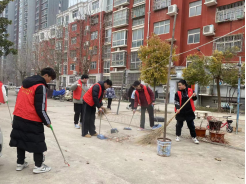 大家手持长夹、扫把等工具,分成小队清理垃圾。一队沿着绿化带一边走,一边搜寻清理散落在草丛中果皮纸屑、塑料袋、生活垃圾等。一队清理道路上的垃圾及道路两边未融化的积雪。